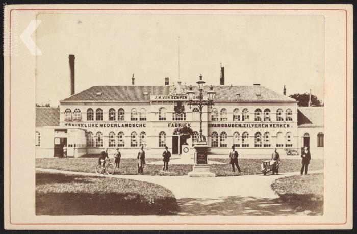Het jaar 1835 wordt aangemerkt als het oprichtingsjaar van de zilverfabriek van J.M. van Kempen & Zonen. In dat jaar vestigde Johannes Mattheus van Kempen III (1814-1877), aanvankelijk theologiestudent, zich als kashouder – winkelier zouden wij nu zeggen – aan de Choorstraat in Utrecht. Hij zette de traditie voort van zijn grootvader die edelsmid en kashouder was en zijn vader, eveneens kashouder. Zijn bescheiden bedrijfje zou hij weten uit te bouwen tot Nederlands grootste zilverfabriek met internationale uitstraling. 1 Als gevolg van een toenemende vraag naar kwalitatief goed en betaalbaar zilver door een groter wordende groep van welvarende klanten, expandeerde de zilverproductie in het midden van de negentiende eeuw. De innovatieve ondernemer Van Kempen realiseerde zich goed dat fabrieksmatige zilverproductie op den duur de ambachtelijke edelsmeedkunst zou verdringen. Vanaf 1853 vervaardigde zijn bedrijf ook juwelen. Als eerste Nederlandse zilverfabrikant introduceerde hij technische vernieuwingen in het productieproces. Toen hij geen vergunning kreeg zijn verdere uitbreidingsplannen in Utrecht te realiseren, liet hij in 1858 - hij had inmiddels vijftig werknemers in dienst - een moderne fabriek bouwen in Voorschoten, waar hij onder andere stoommachines uit Engeland liet installeren. Bij de opening van de nieuwe fabriek werd hem het predicaat Koninklijke verleend en de bedrijfsnaam luidde vanaf dat moment Koninklijke Nederlandsche Fabriek van Gouden en Zilveren Werken J.M. van Kempen & Zonen. De locatie was dichtbij de hofstad, er waren goede afzetmogelijkheden en transport was makkelijk over het spoor en, per schip, over de Vliet. 2