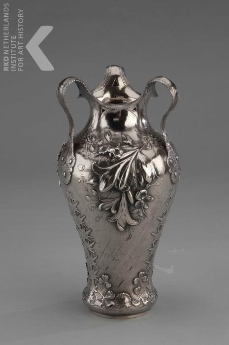 De schaal is uit de hand geslagen en met den meesten zorg gedreven. Zij stelt voor een achtbladige lotusbloem. Elk blad draagt een boom met zeven vruchten voorstellende de zeven gebieden der natuur. Door iederen boom zijn twee slangen gevlochten voorstellende de tweevoudige ontwikkeling in de natuur (goed en kwaad). – In de à jour bewerkte vlakken tusschen de bladen zijn afwisselend vier oude symbolen gedreven. (1) de vijfpuntige ster, als zinnebeeld der kunst, enz., (2) de swastika of het Jaina kruis, der altijd durende beweging, (3) het wereldkruis der oude grieken, zinnebeeld van geest en stof; en (4) de twee door elkander gewerkte driehoeken, het hoogere en lagere beginsel in den mensch. Het voetstuk is uit één en plaat geslagen, daarna doorgezaagd en met een massieven greep geklonken. Dit stuk werd ontworpen en uitgevoerd door F. Zwollo kunstdrijver in edelen metalen te Amsterdam, op de Internationale tentoonstelling te Turijn met de gouden medaille bekroond en aldaar verkocht (anno 1902).
