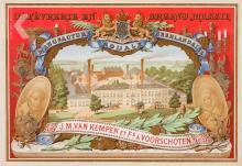 De omranding van de fabriek bevat eveneens veel betekenisvolle informatie: het predicaat Roijale (koninklijk) prijkt bovenaan in het midden, direct onder de Nederlandse leeuwen die het gekroonde wapen flankeren. Aan de boven- en zijranden worden voorbeelden getoond van pronkstukken en serviezen, aan de onderkant liggen een lauwertak en diverse onderscheidingen die de fabriek ten deel zijn gevallen. Links- en rechtsonder staan ronde plaquettes afgebeeld met portretten van Van Kempens illustere, zeventiende eeuwse voorgangers: Adam van Vianen en Johannes Lutma. Daaronder liggen de gereedschappen van de ambachtelijk werkende zilversmid: een hamer, beitel, tang en ponsje. Hiermee liet Van Kempen aan een internationaal publiek zien dat hij de hoogstaande zilversmeedkunst uit de zeventiende eeuw voortzette, het ambacht in ere hield, kunstwerken produceerde en tegelijkertijd een moderne fabrikant was die zijn sporen had verdiend tot ver over de grenzen. Een afbeelding, kortom, die helemaal past in de tijd van de industriële vooruitgang.
