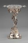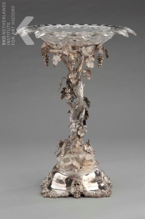 Rechts daarnaast staat een tafelstuk dat nu tot de museale Zilver Top 100 behoort: een kristallen schaal in rustieke stijl uit 1863. Sinds 1858 had Van Kempen deze typische vorm van een stronk toegepast bij onder andere kandelabers. 3 Bovenaan de stronk wordt de kristallen schaal ondersteund door druivenbladeren waartussen trosjes druiven hangen. Aan de voet van dit tafelstuk bevonden zich, zoals te zien is op de foto uit 1867, een hertenbok en een hinde. Deze zijn tegenwoordig niet meer op het stuk aanwezig, maar er zijn nog wel twee gaatjes in de voet te zien. Op de voet prijkt de inscriptie: ‘Aan Mr. N.F. van Nooten (zijn gewezen voogd) voor de vele zorgen en blijken van genegenheid toegewijd door J.J. van Geuns’.