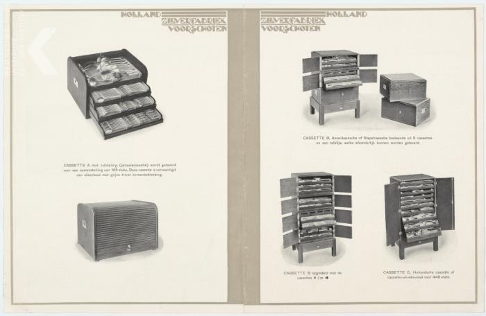 Twee pagina's met cassettemeubels uit de catalogus van de Zilverfabriek Voorschoten, 1928; inv.nr. 3045